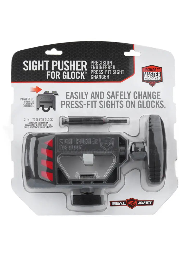 The Real Avid Sight Slider is an extremely robust tool for changing Glock rear sights . This tool was specifically designed to ensure the pistol and the sight itself are optimally protected from damage during sight replacement .