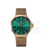 GW-12-2-24 kombinira preciznost i stil. Kućište od nehrđajućeg čelika boje kojota (44 mm) susreće se s mrežastom narukvicom od nehrđajućeg čelika boje kojota – robusno, udobno i savršeno usklađeno. Zeleni brojčanik s prepoznatljivim GLOCK-ovim nazubljenjima naglašen je srebrnim kazaljkama i indeksima sa švicarskim Super-LumiNova® premazom i zaštićen safirnim staklom od 2 mm . Vodootpornost od 10 ATM , prikaz datuma i japanski mehanizam čine ovaj sat svestranim suputnikom – od ureda do vikend putovanja.